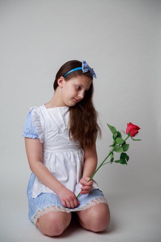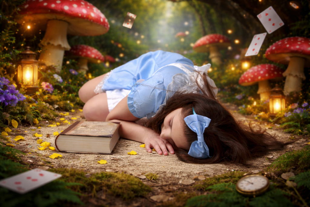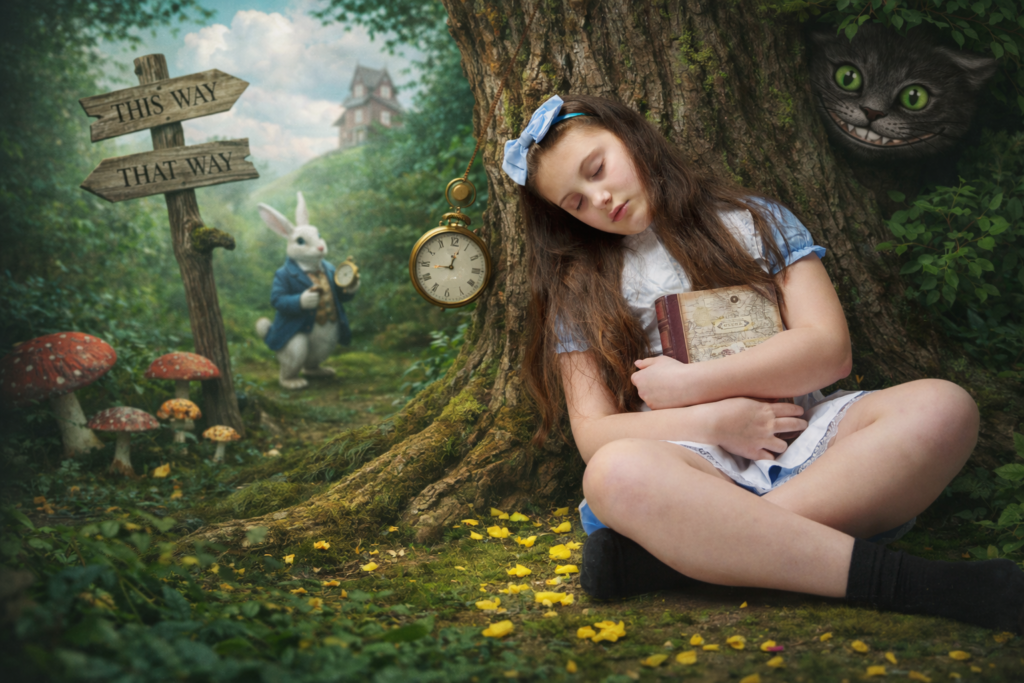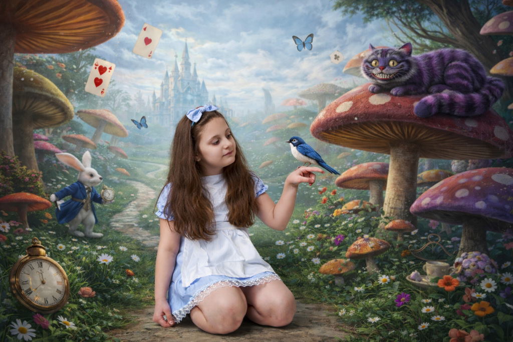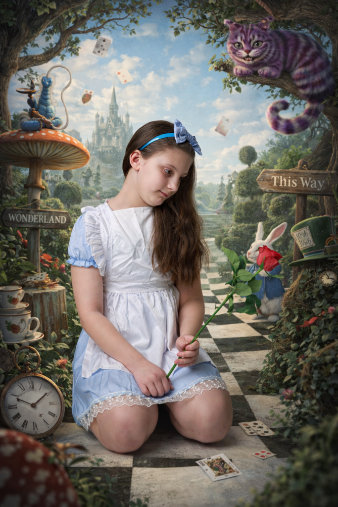 I have uploaded my favourites into ChatGPT and utilise a prompt similar to the following: “create the scene with my daughter unchanged, placing her into a whimsical Alice in Wonderland environment (for example: giant mushrooms, floating teacups, playing cards, magical forest floor, etc.) while keeping her pose, flowers, book and clothing exactly as they are.”